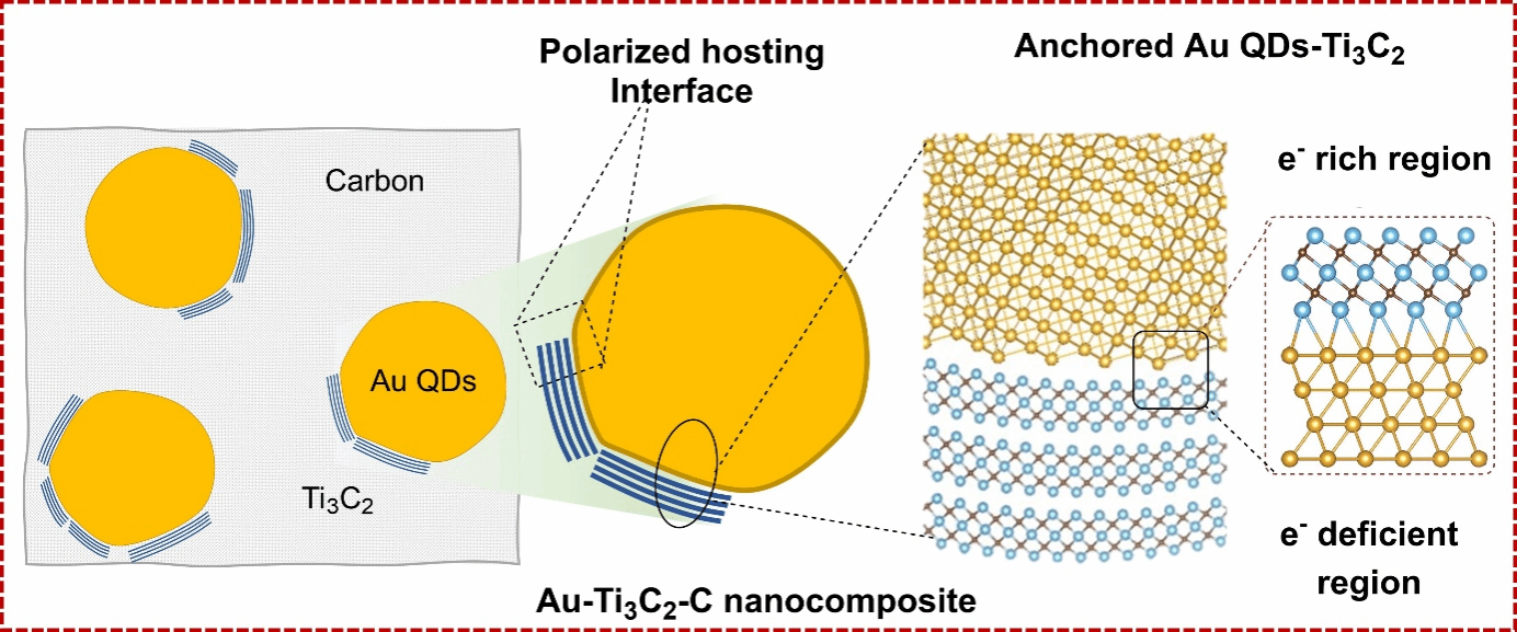 (1)构建极化宿主界面,突破锂吸附传输瓶颈:利用 Au QDs 与 Ti₃C₂Tₓ功函数差异形成极化界面,诱导缺电子纳米囊袋,大幅提升锂吸附与电荷离子传输效率。