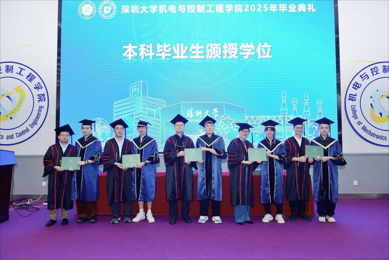 14时整,国歌声中,本科生毕业典礼正式拉开帷幕。2021级自动化专业范炜健作为毕业生代表上台发言,以“微小尘埃到逐梦青年”的成长轨迹引发共鸣:“从加入Autoleaders社团到参与国家级大创项目,从申请专利到发表顶级会议论文,深大机电的四年让我找到人生坐标——保送北大集成电路设计自动化方向读博,正是学院平台与导师培养给予的底气。”他面向全场同窗呼吁:“无论深造还是就业,请铭记‘自立、自律、自强’校训精神,保持对世界的好奇与逐梦的热情!”