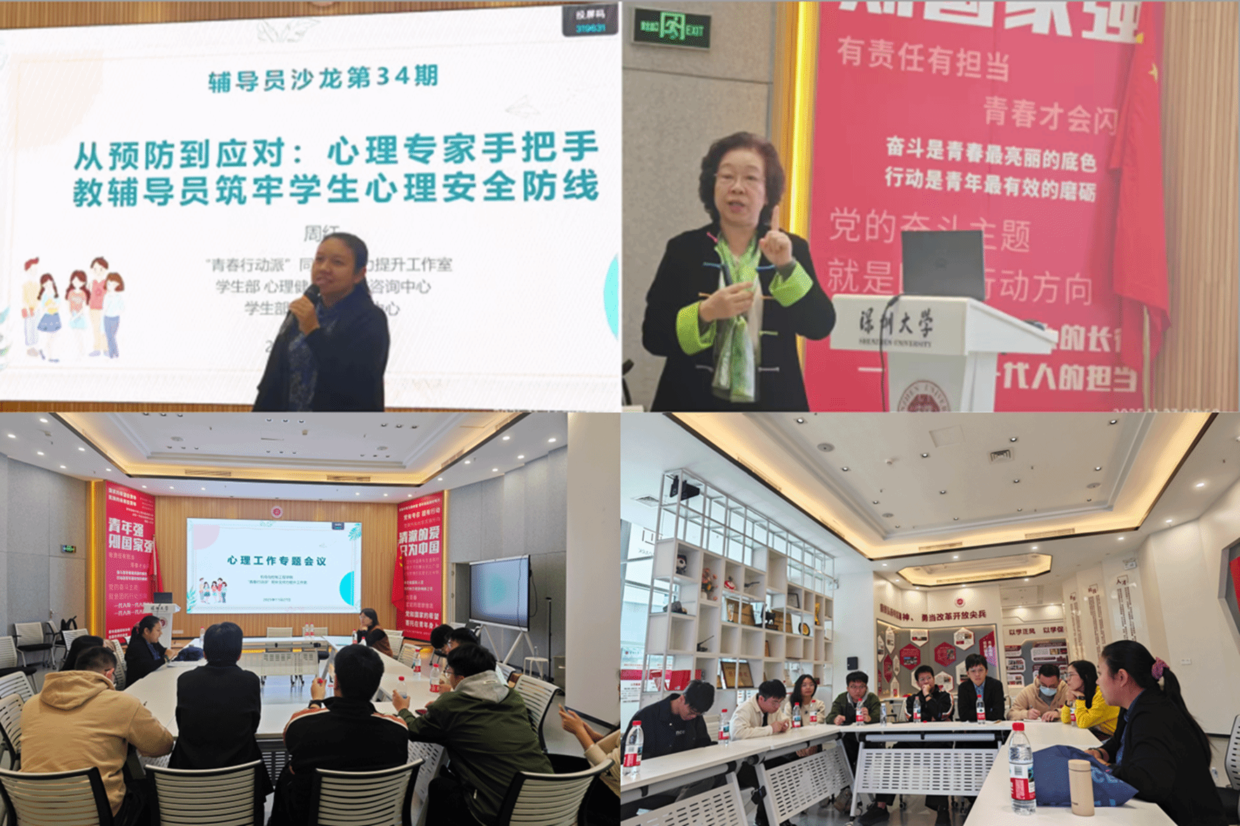 会议的第一部分为学生部心理健康教育与咨询中心、辅导员发展中心以及“青春行动派”同伴支持力提升工作室共同主办的第34期辅导员沙龙——从预防到应对:心理专家手把手教辅导员筑牢学生心理安全防线。沙龙发起人、学院党委副书记邓琳致辞,强调新时代高校心理育人工作的重要性,要发挥辅导员守护学生心理健康的关键力量,筑牢心理安全防线。深圳大学原心理辅导中心主任周红副教授进行专题培训。周红指出辅导员需成为“陪伴者”,为学生构建安全、不批判的倾诉空间;同时要作为“赋能者”,为学生成长提供支持与动力;最后,周红重点强调辅导员作为“成长者”以通过科学的压力管理实现工作与生活的动态平衡。